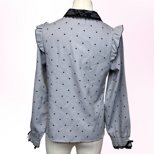 Japanese Brand 'Dear My Love' Greyish Blue Heart Print Long Sleeve Blouse [Secondhand]