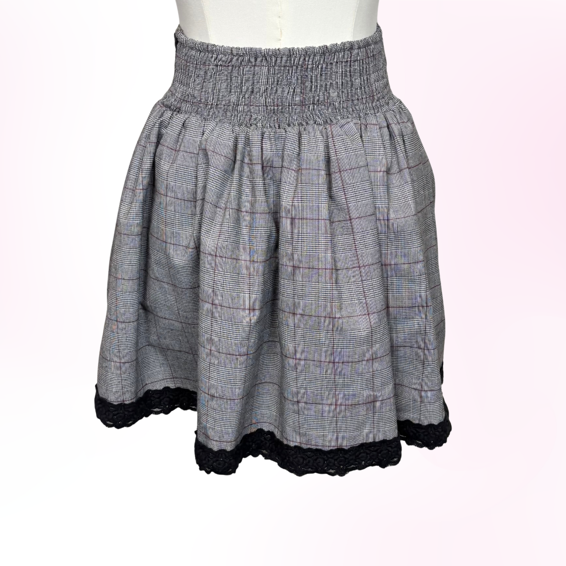❥ A cute grey check pattern plaid skirt with a black ribbon lace up detail on the front. The waistband and hemline has black lace detailing.