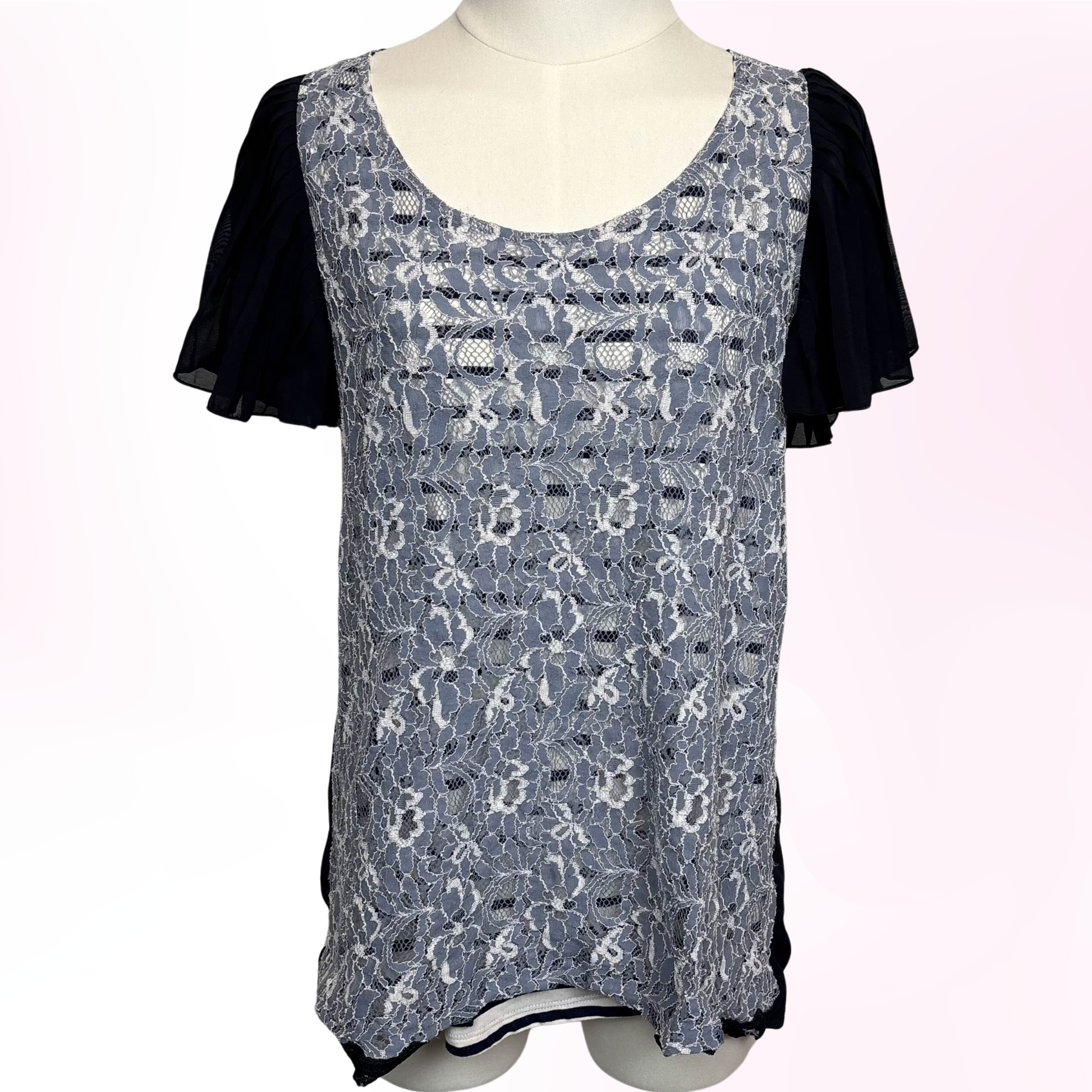 ❥ A super cute short sleeve top that features a dusty blue lace print over top a navy and white stripe base. The sleeves and back are a sheer navy blue. The back is transparent and sheer.