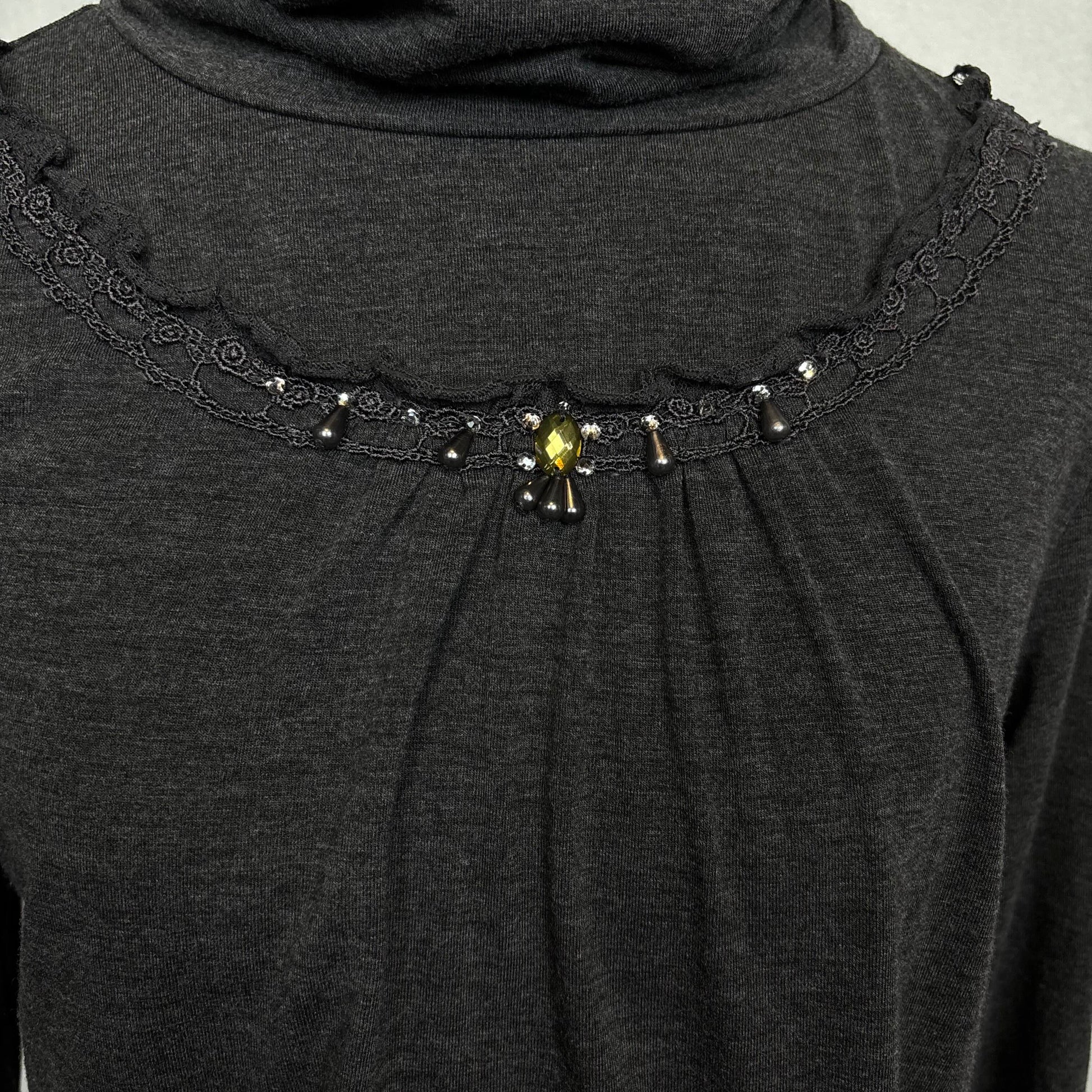 ❥ A super cute dark grey turtleneck that features beaded detailing on the chest and some ruched details on the sleeves. It's a super cute and simple basic that would look cute with anything >.<