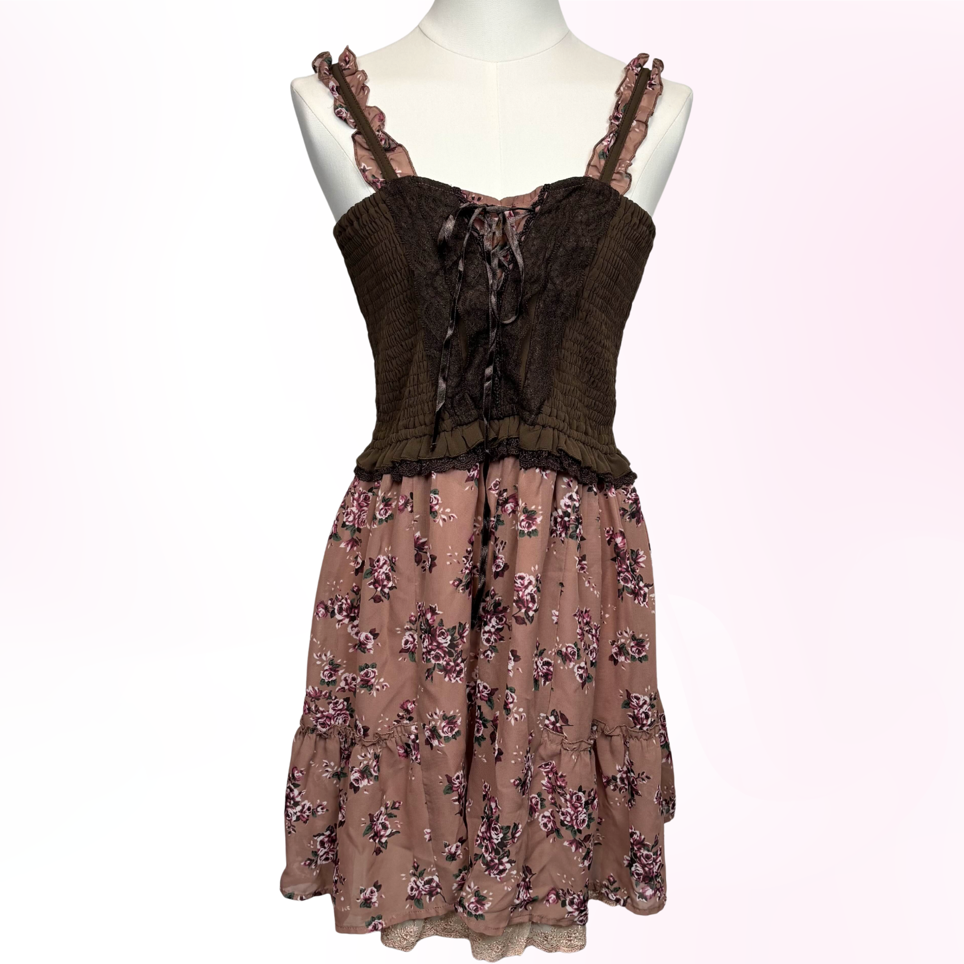 ❥ Super cute dress with a brown ruched top that has a ribbon that ties and lace bordering it. The skirt is a dusty rose pink color that features an elegant floral design. The straps have ruffled floral fabric on it.