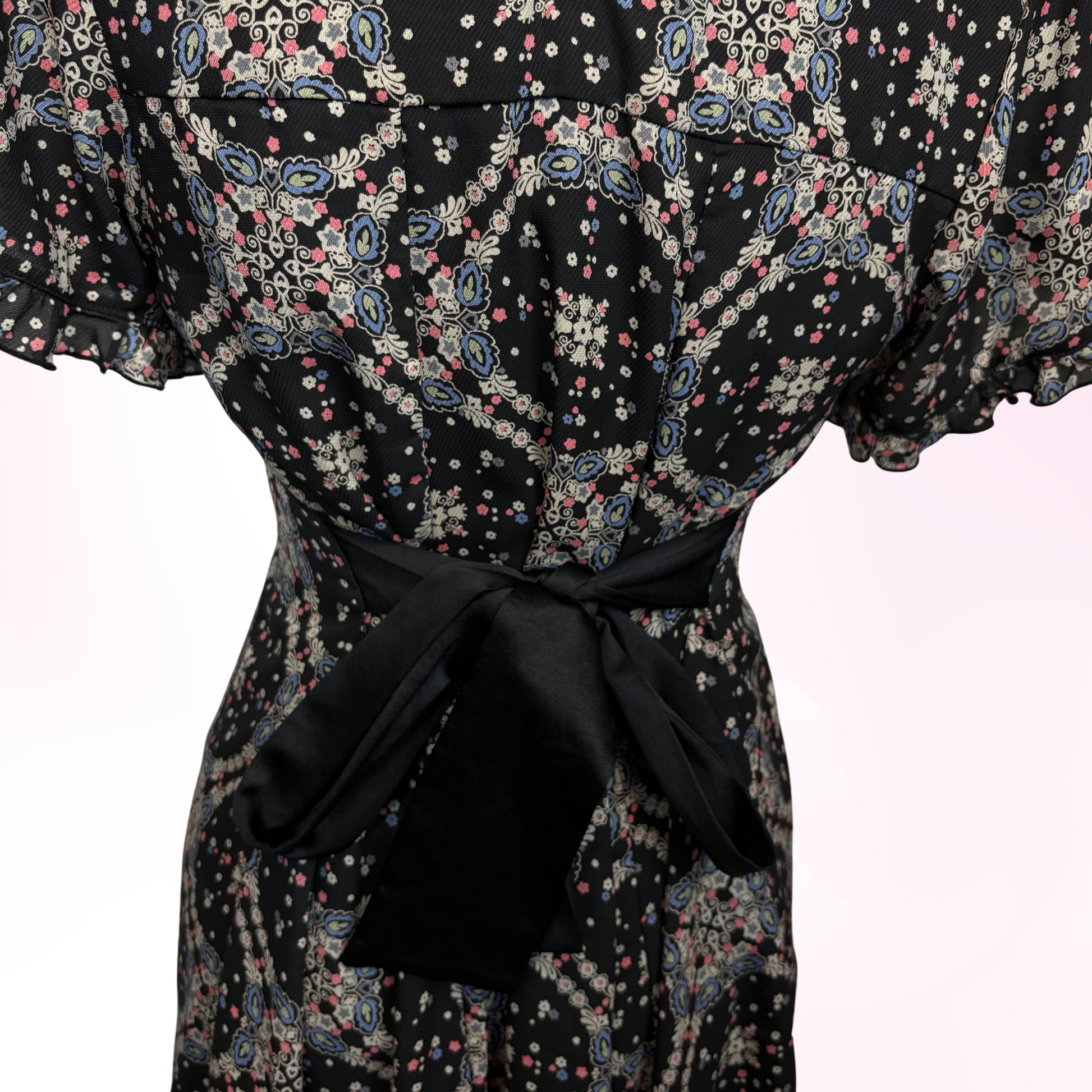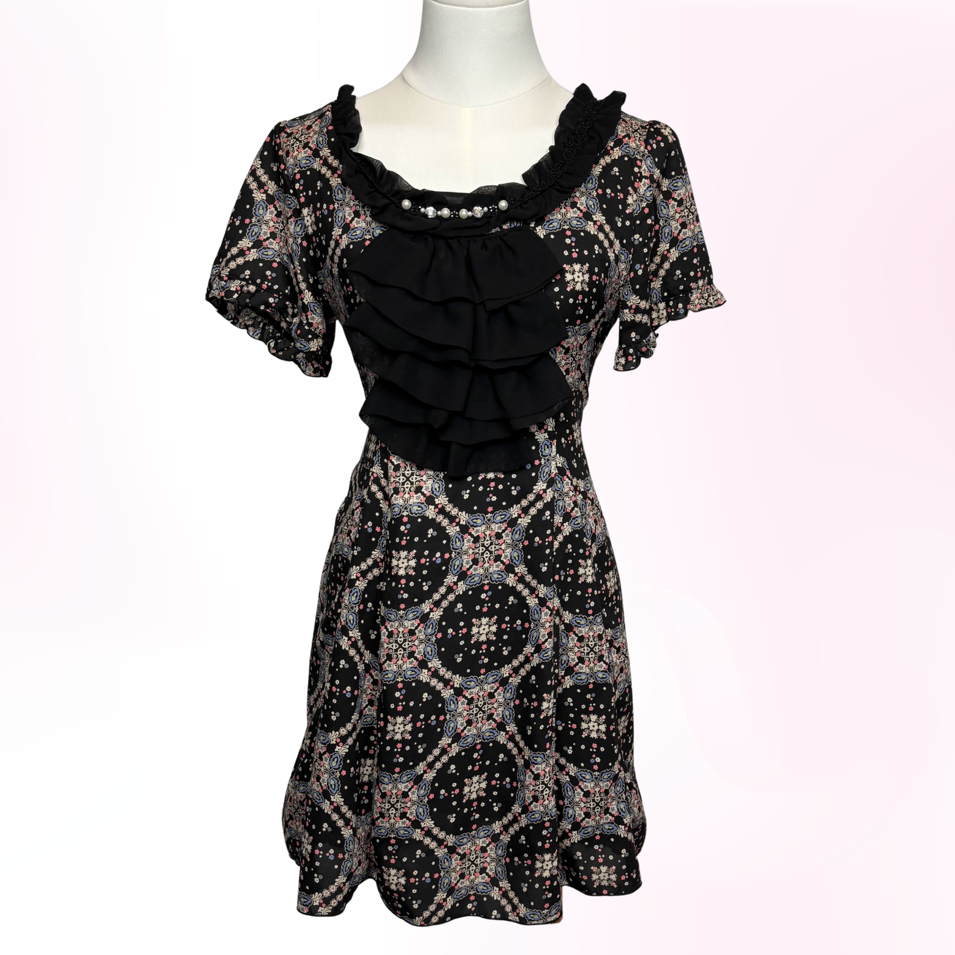 ❥ A beautiful black dress that features a pink, blue, cream colored geometric floral pattern throughout the entire piece. It has black ruffles on the front chest. Around the neckline it has more black ruffles with pearl detailing. The back has a black ribbon that ties and snatches the waist.