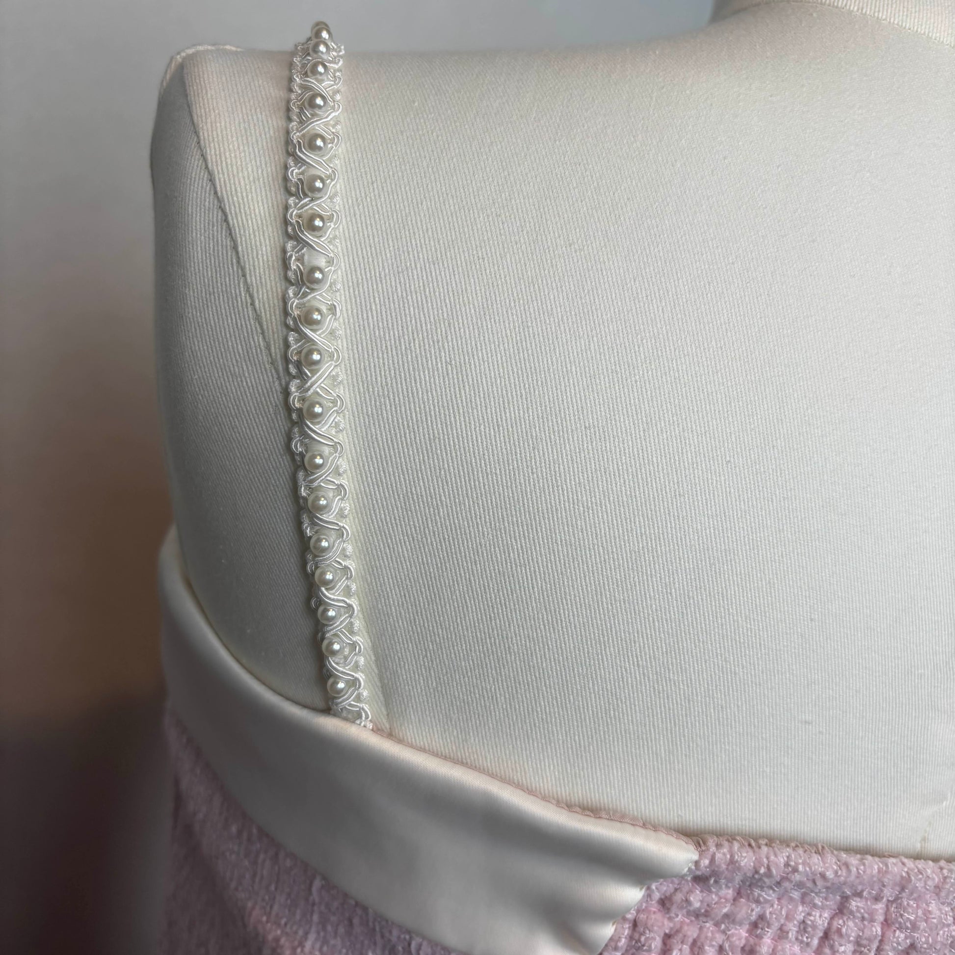 ❥ A gorgeous pink tweed dress that features a satin bow on the front. It has lace detailing down the front. The straps have beautiful pearl detailing along them. It is unused with tags !