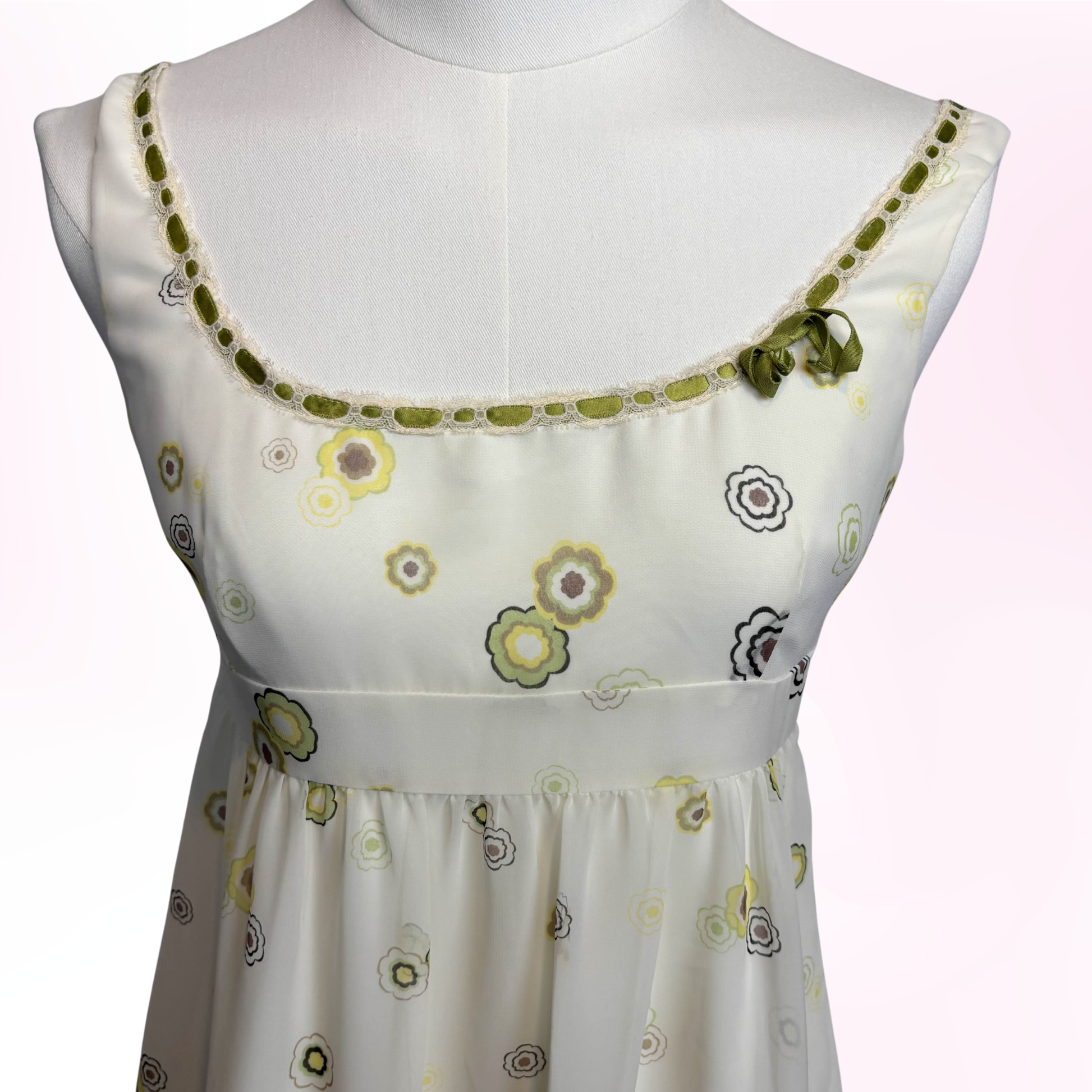 ❥ A super cute off-white flowy tank top dress that features a yellow, green, and brown flower pattern throughout it. It gives very frutiger aero/metro vibes in my opinion ! It has green ribbon detailing along the neckline