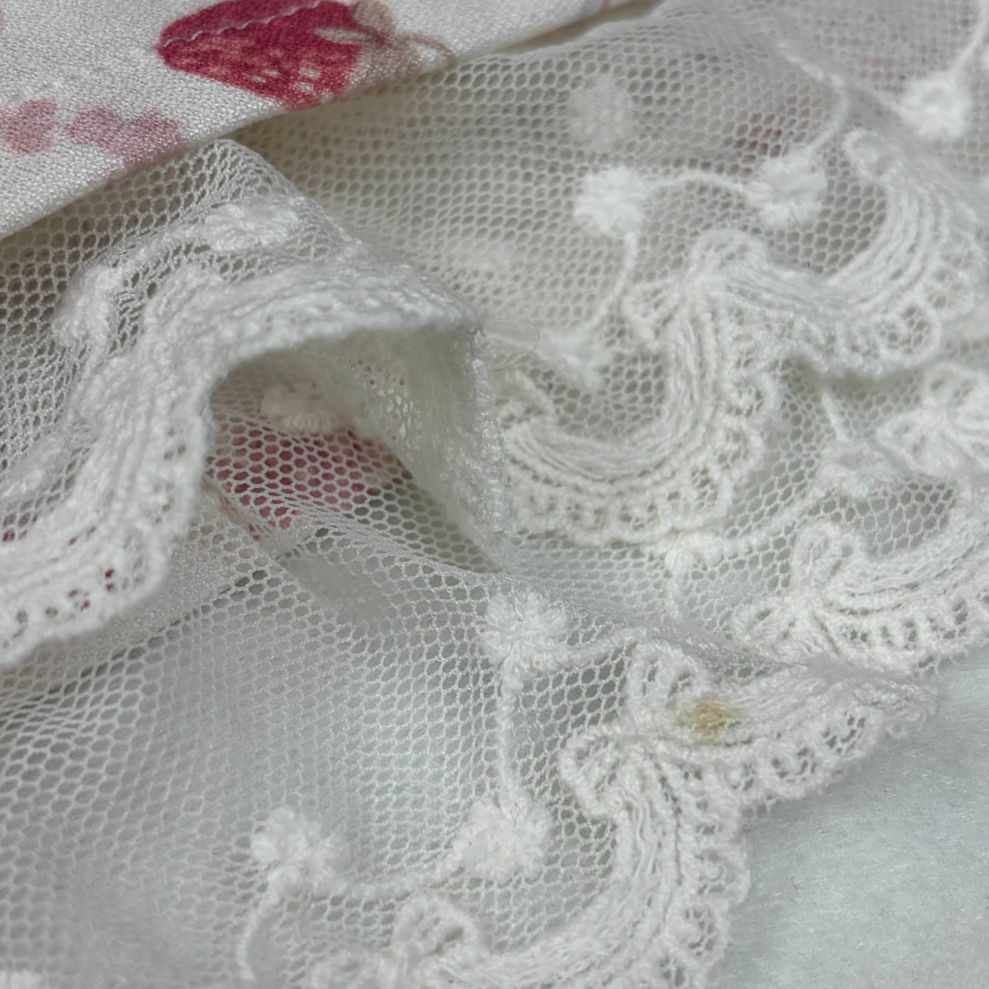 ❥ This is an adorable skirt that features a design of strawberries, macarons, flowers, etc. The front features two cute little bows and lace detailing. The back waistband has some elastic.
