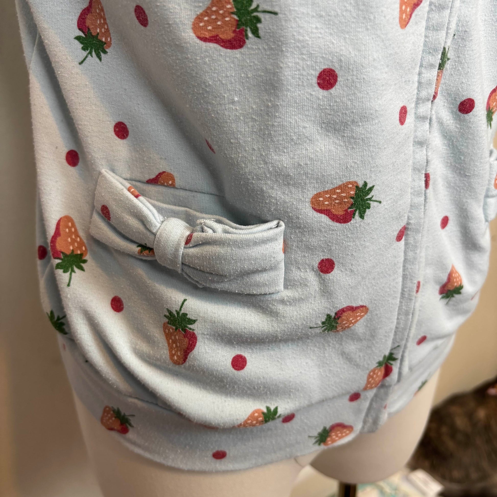 ❥ An adorable light blue hoodie that features a strawberry design throughout the whole thing. It has short sleeves. The pockets have bow detailing on it >.< I believe this is a more y2k piece though >.<
