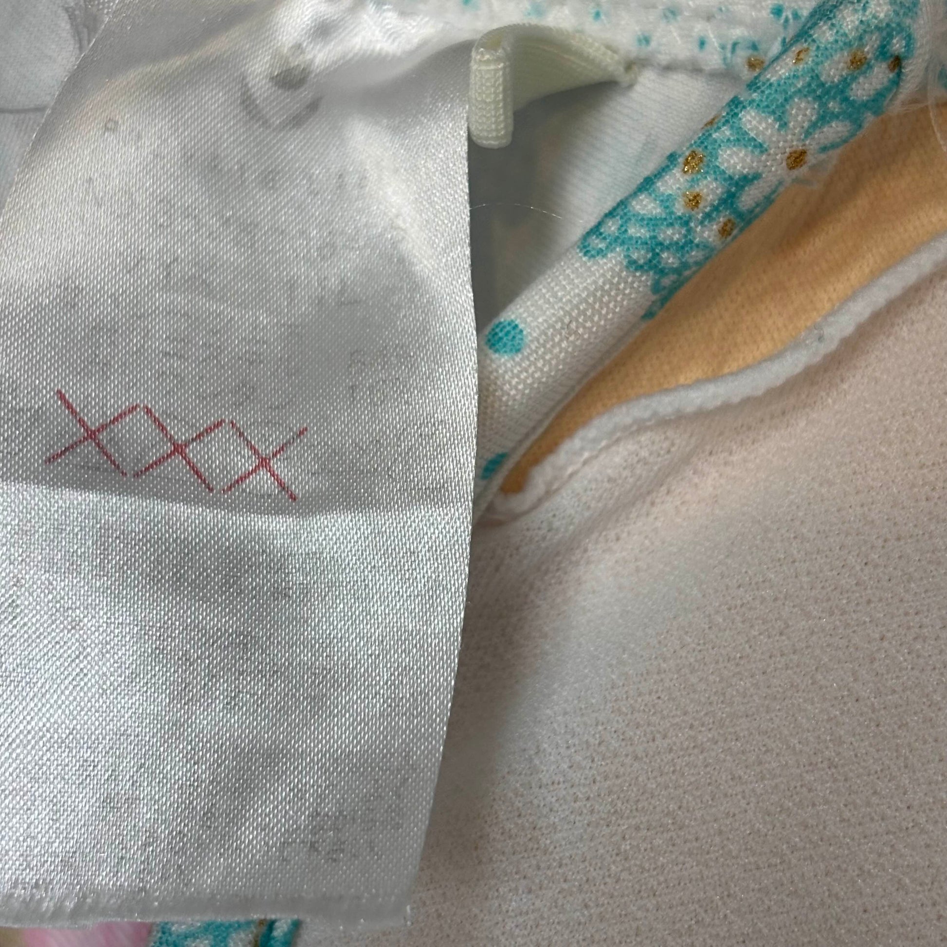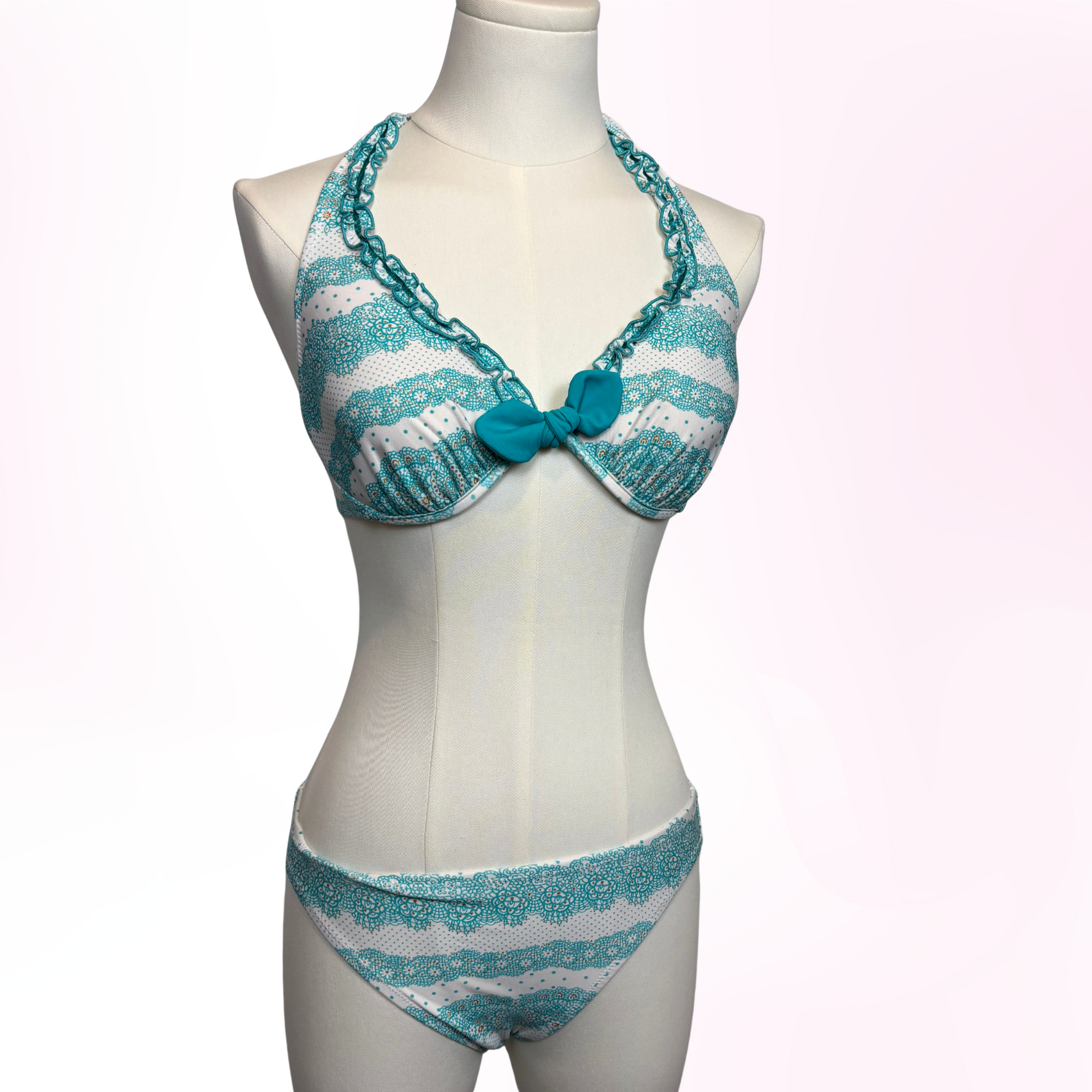 ❥ This is an adorable teal and white bikini. It includes a bikini top, bottom, and skirt. The design is a cute flower/mandala type pattern. It almost looks like stripes from far away. It has a cute bow on the bikini top and around the waist of the skirt.
