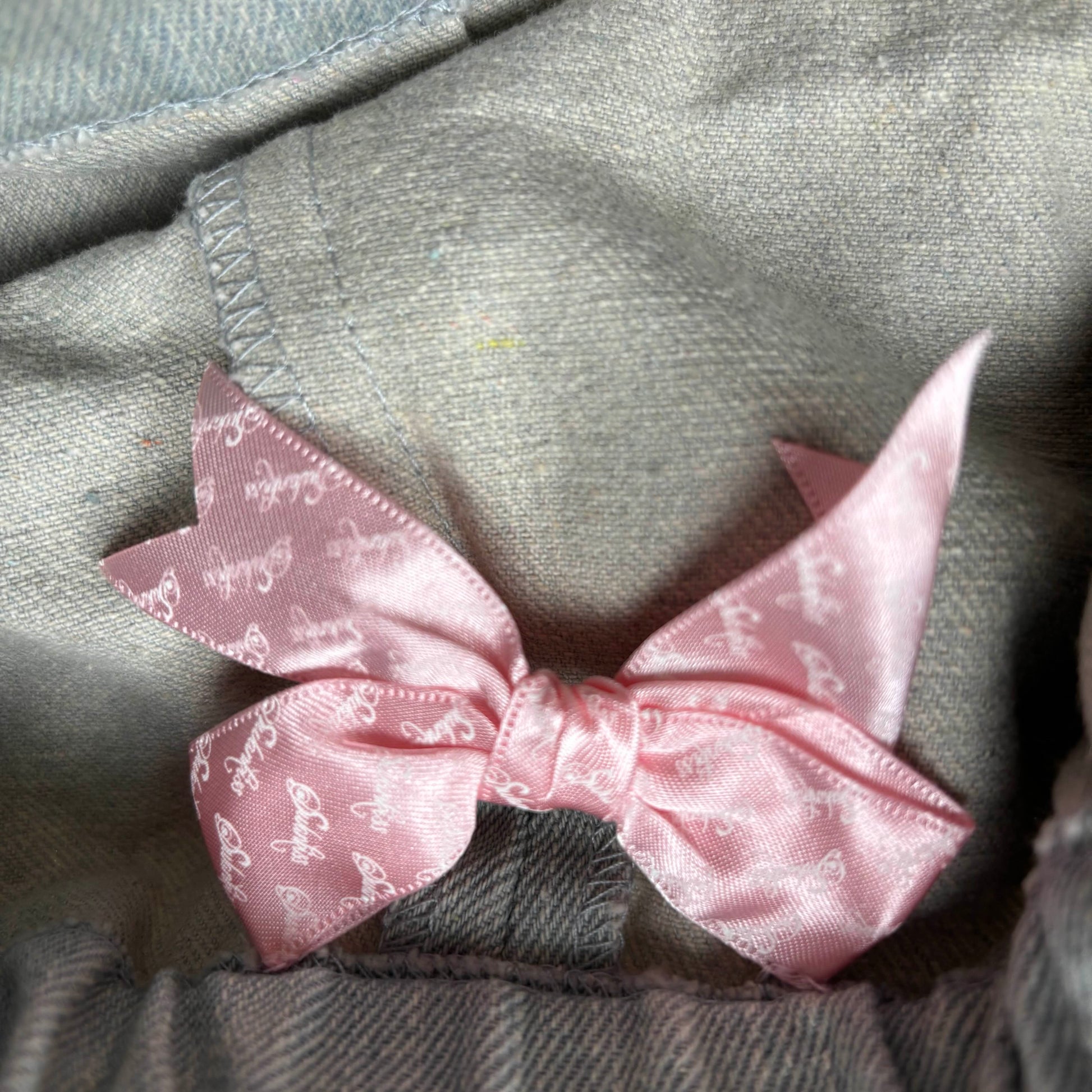 This is a greyish blueish hue denim skirt that has white ruffle tulle detailing at the bottom. The scalloped hem is adorned with bows and sequins.